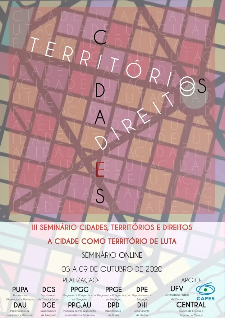 A Universidade Federal de Viçosa realizou, entre os dias 05 e 09 de outubro de 2020, o III Seminário “Cidades, territórios e direitos”, organizado pelos Departamentos de Arquitetura e Urbanismo, Ciências Sociais, Geografia, Educação e Direito, juntamente com seus programas de pós-graduação e laboratórios. A proposta foi refletir sobre a temática das cidades, seus territórios e o distinto acesso aos direitos, além de situar a própria cidade na lógica global.